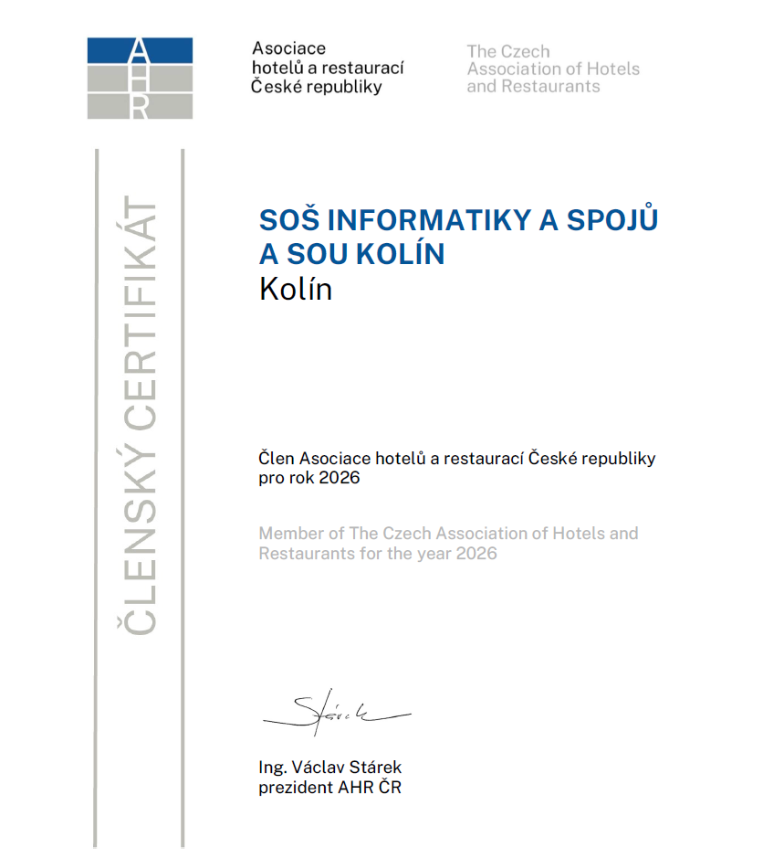 V lednu 2026 se naše škola stala členem Asociace hotelů a restaurací České republiky (AHR ČR). Díky tomuto členství získají naši studenti přístup k aktuálním trendům v oblasti cestovního ruchu, možnost odborných exkurzí i setkávání s profesionály z praxe.
