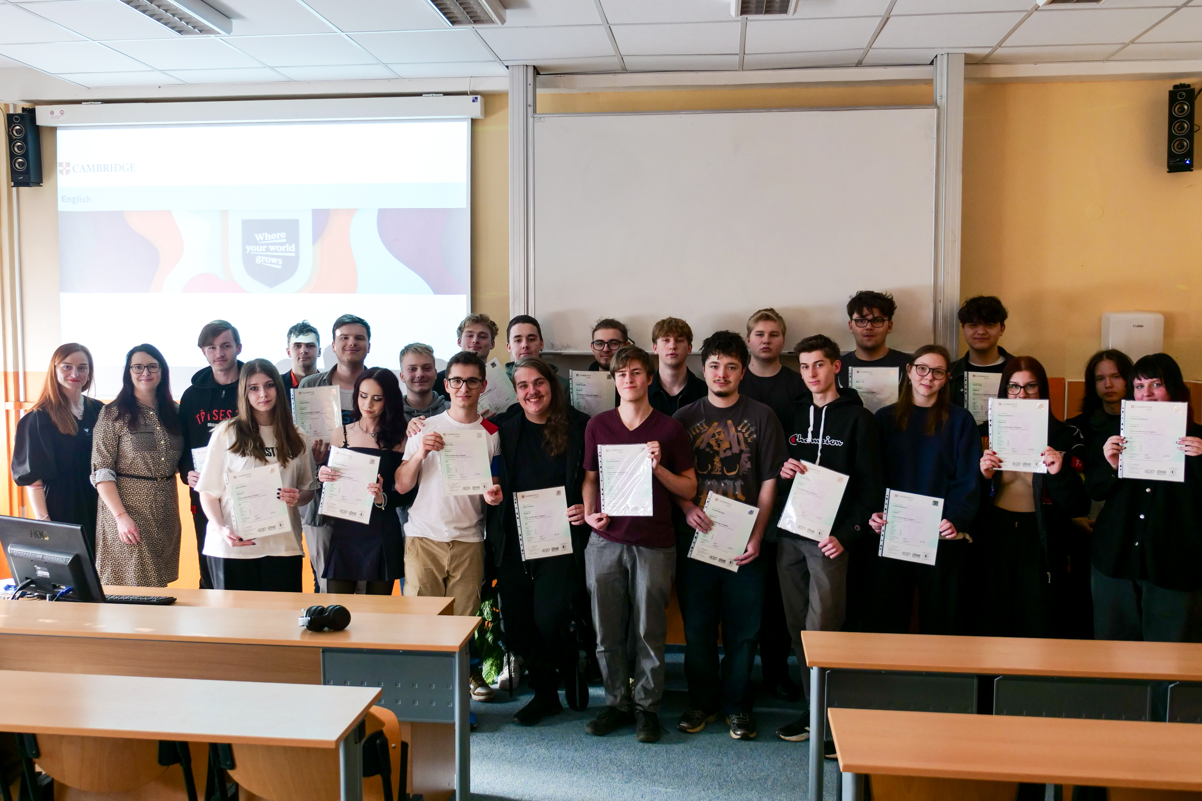Na naší škole proběhlo již potřetí slavnostní předávání mezinárodních jazykových certifikátů Cambridge English. Letos si své certifikáty převzalo 29 studentů, kteří úspěšně složili zkoušky na úrovních B2 a C1.