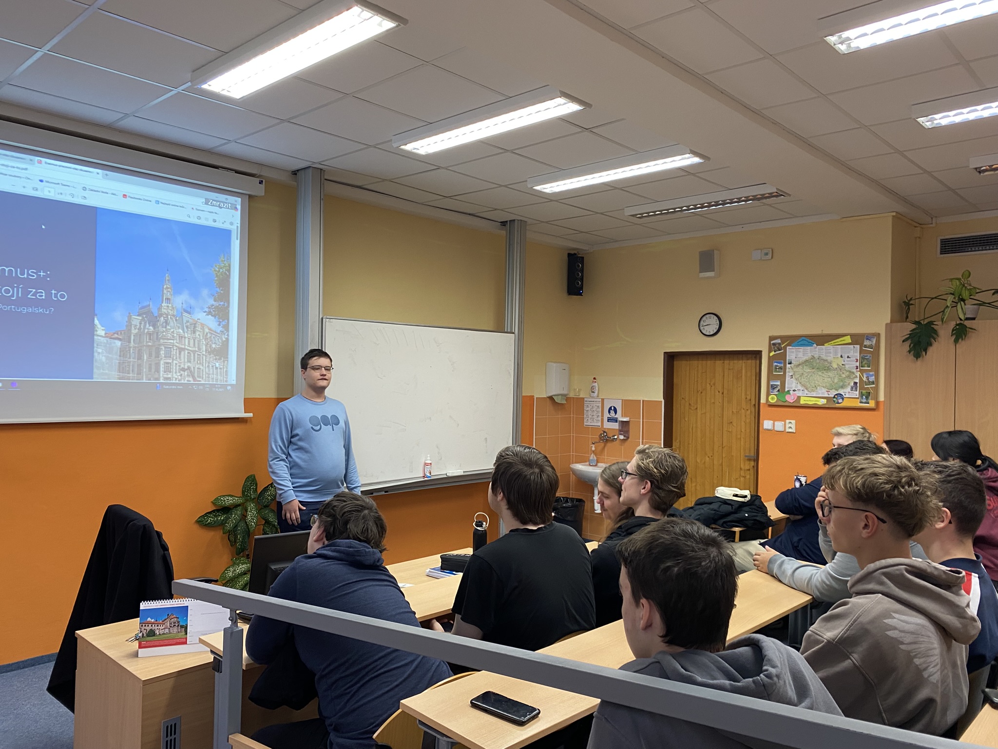Závěrem své prezentace vyzval studenty, aby se nebáli přihlásit a využít příležitost, kterou program Erasmus+ nabízí.
