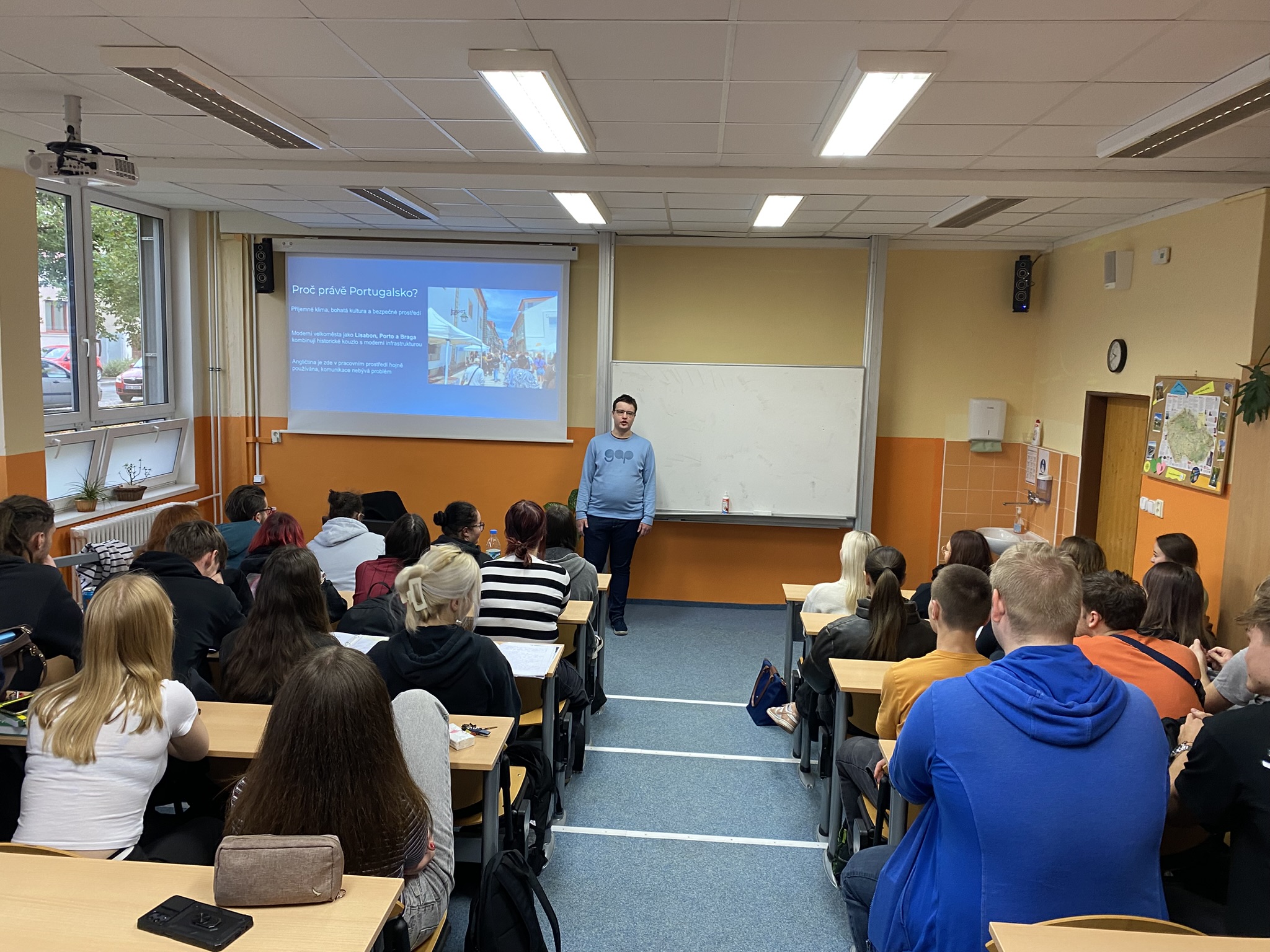 Dne 17. října 2025 zavítal do naší školy absolvent Patrik Ramšák, aby se s žáky čtvrtých ročníků podělil o své zkušenosti z tříměsíční zahraniční pracovní stáže v Portugalsku, kterou absolvoval v rámci programu Erasmus+. Jeho návštěva byla určena žákům tříd 4TA, 4TB, 4C a 4P, které čeká rozhodování o budoucnosti po maturitě.