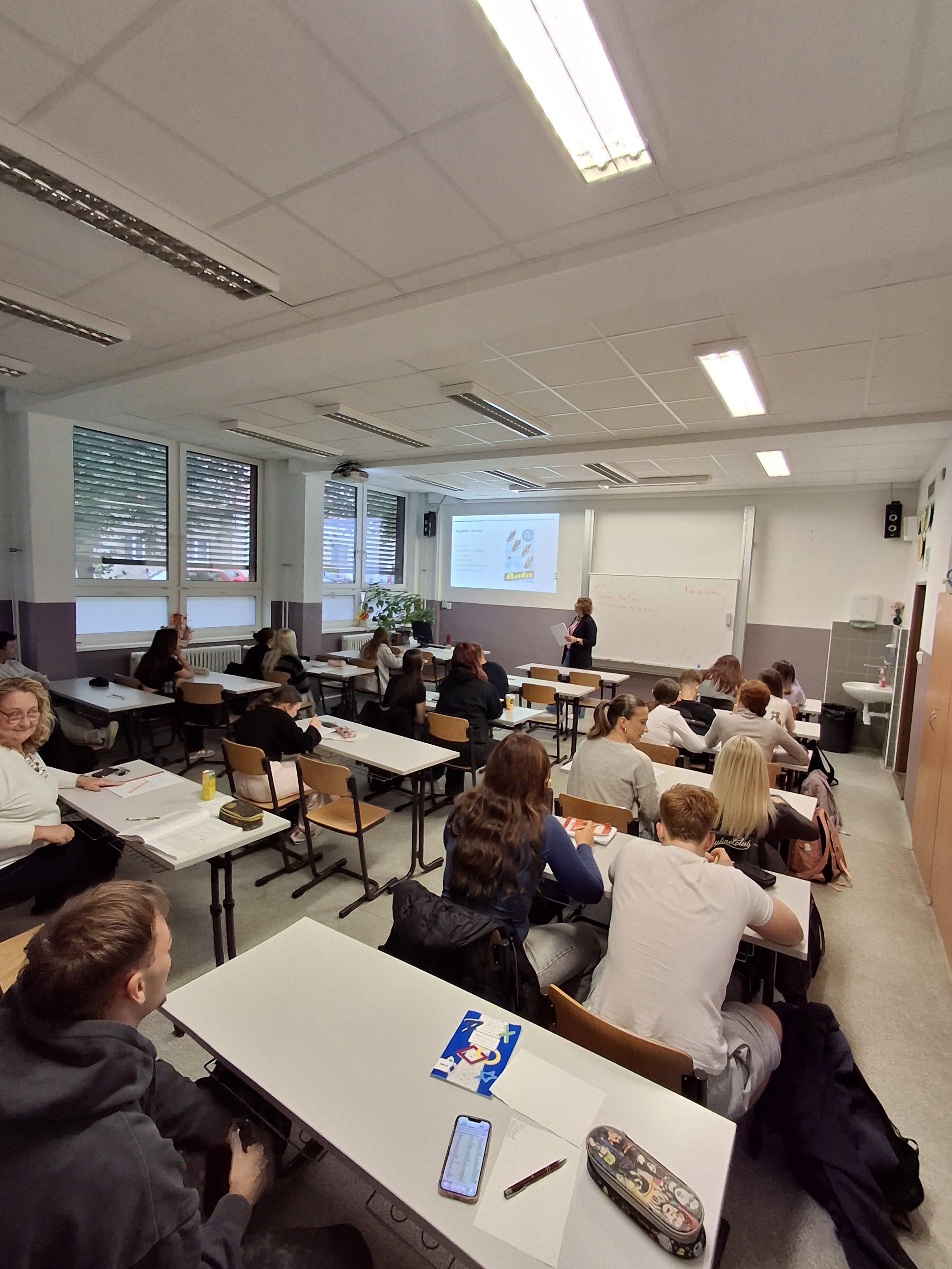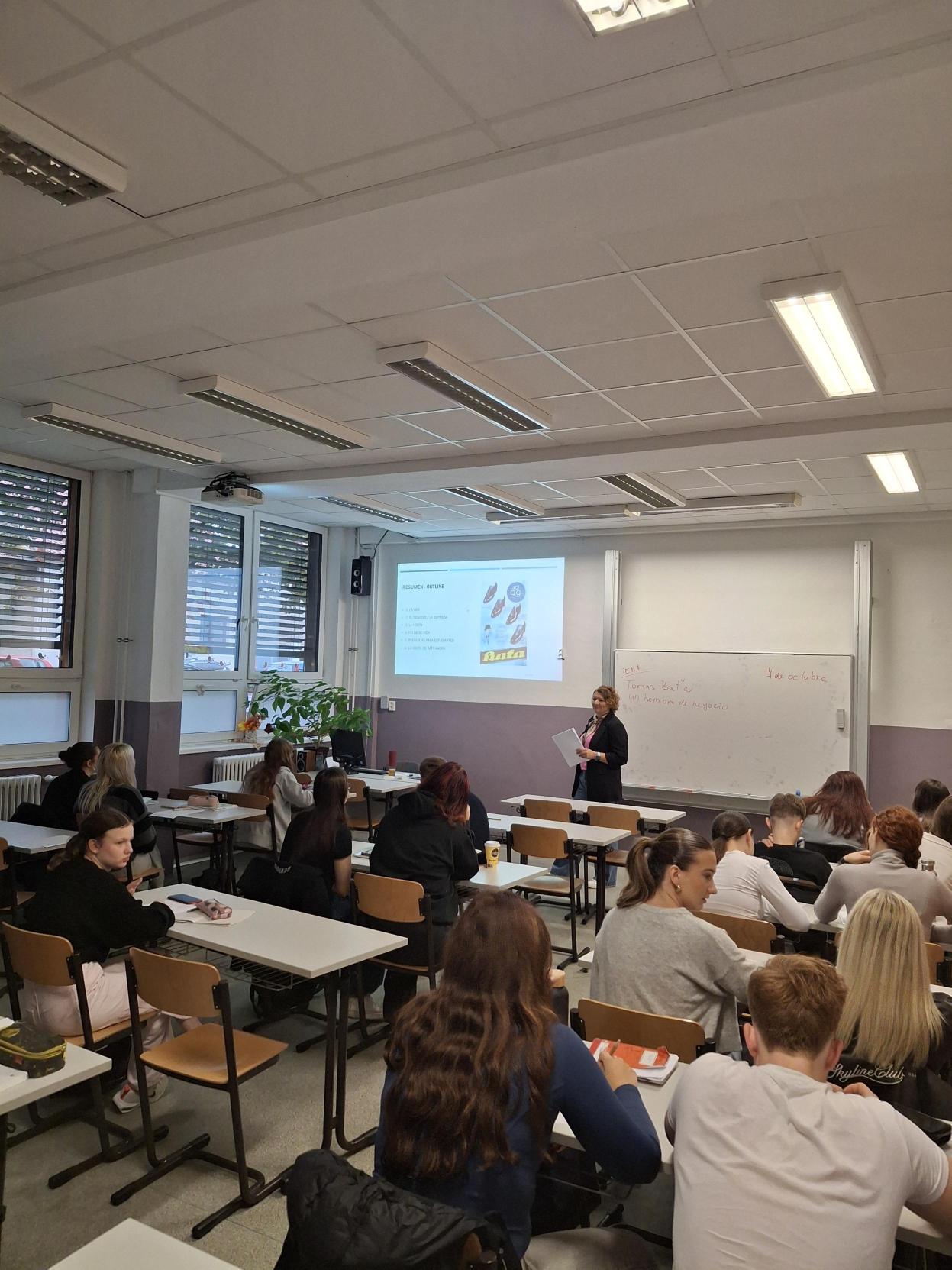 Fue una lección conjunta con la clase de economía de 4C. El tema fue Tomás Baťa y su vida como empresario. Nuestra profesora de español presentó su historia, respondió algunas preguntas en español y aprendimos nuevas palabras relacionadas con la economía.
