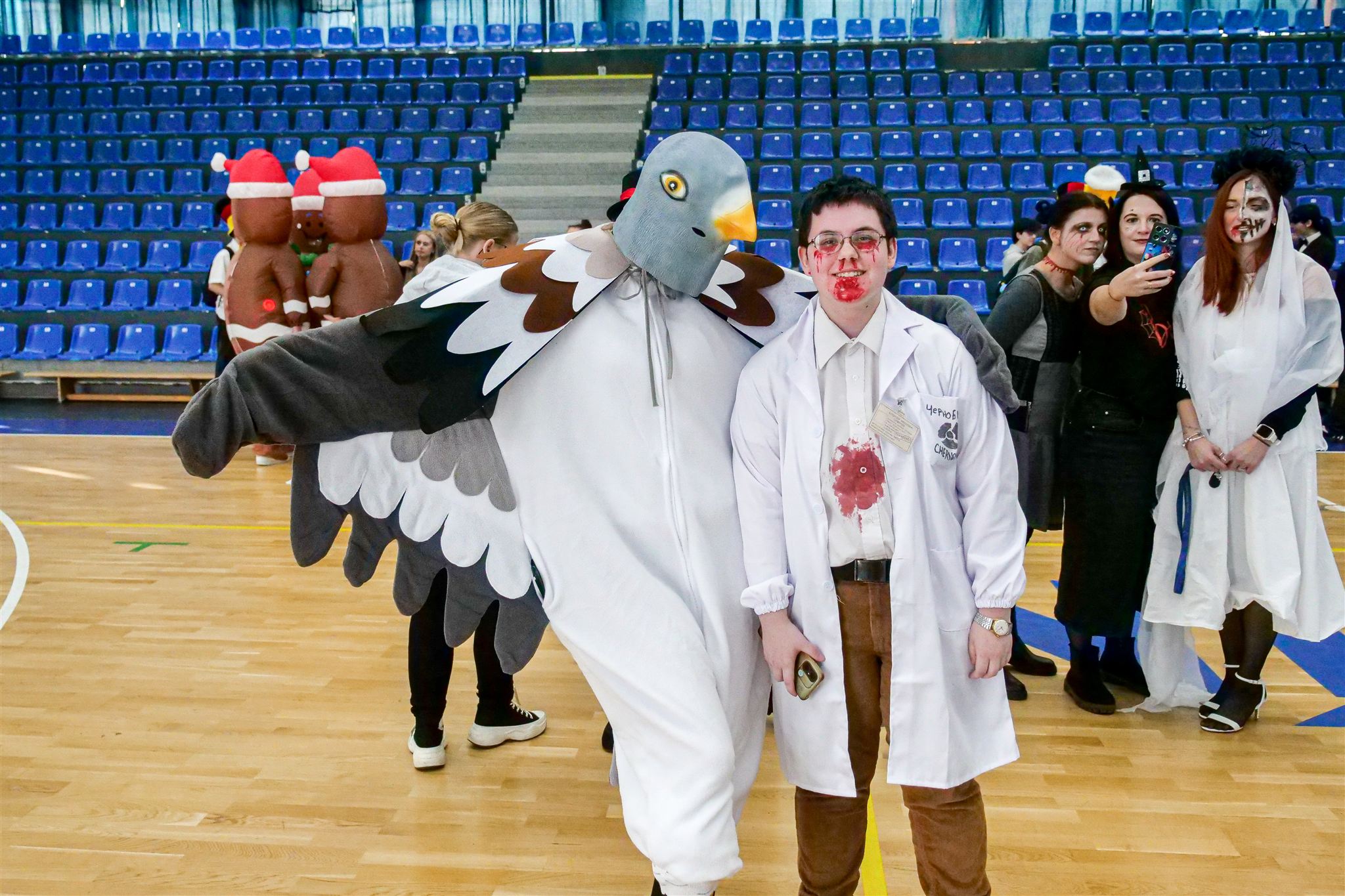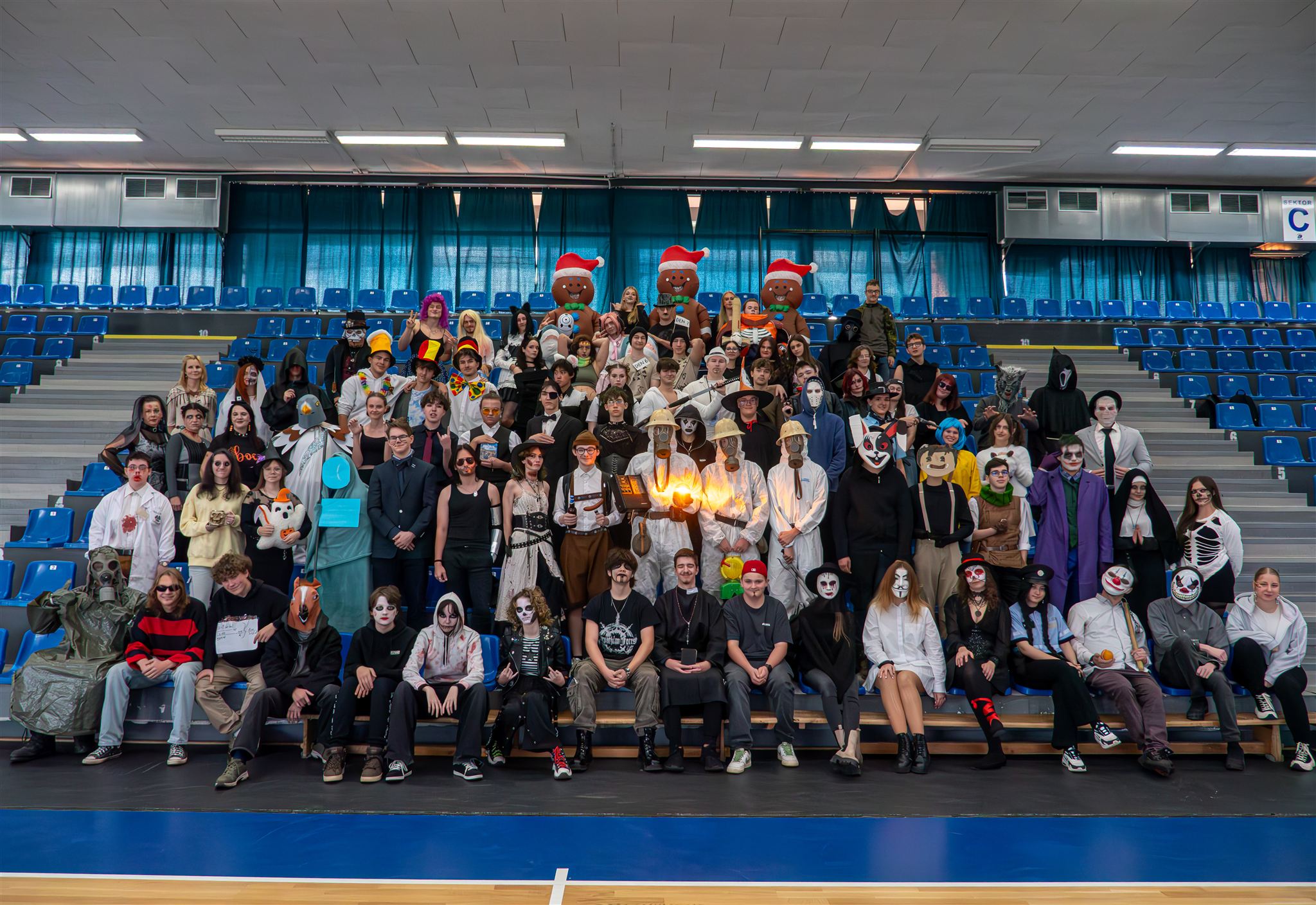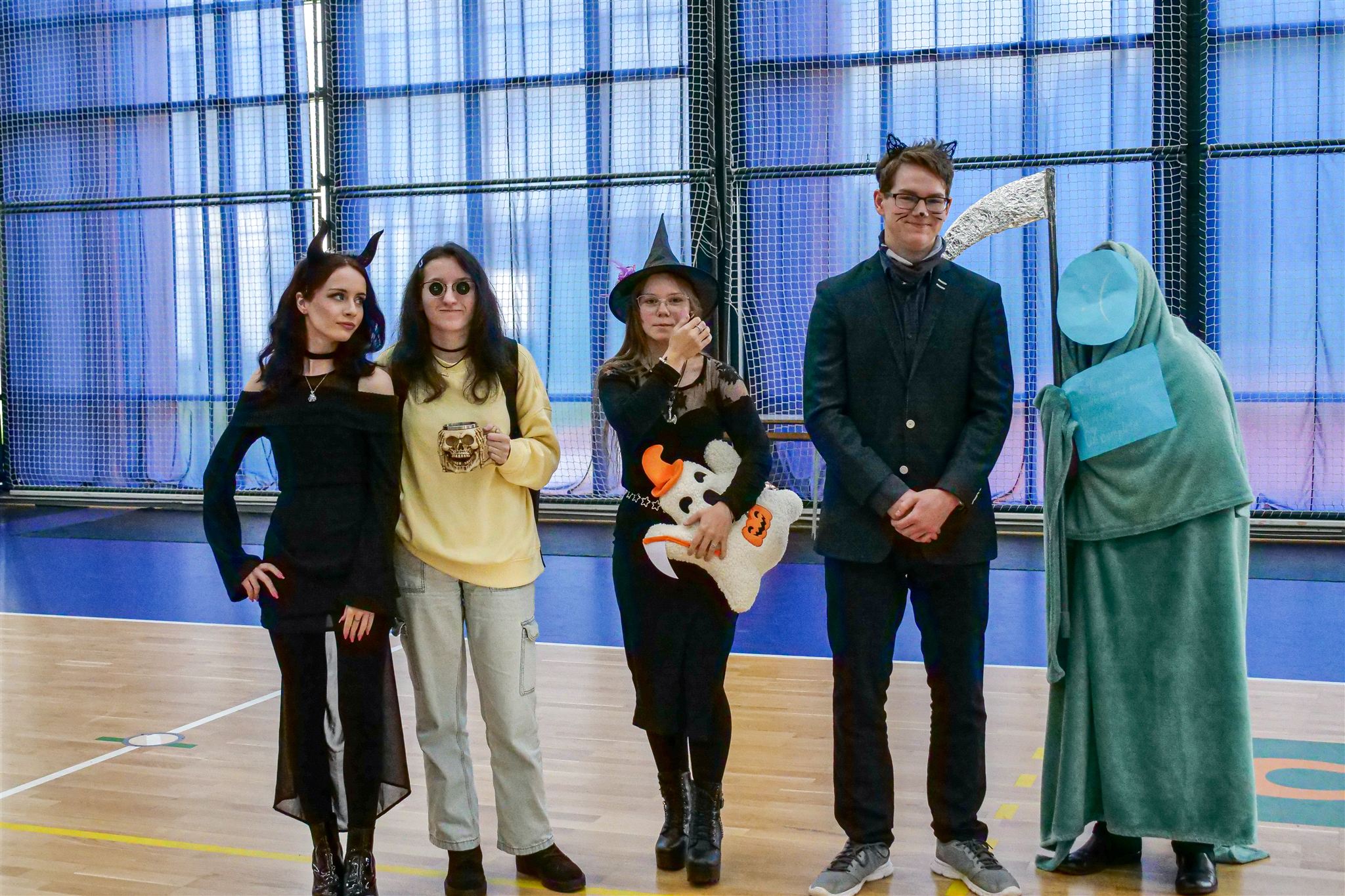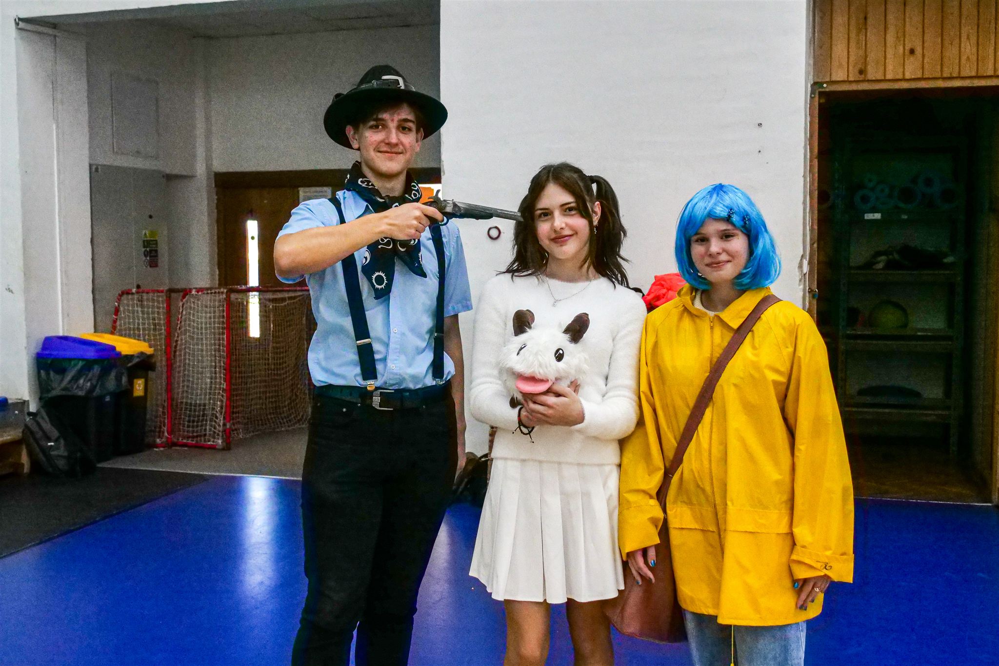 Anglický projektový den na téma Halloween se v naší škole uskutečnil ještě poslední den před podzimními prázdninami. Škola se na celý týden ponořila do Halloweenských barev a na chodbách jste mohli vidět strašidla a příšery všeho druhu. Pro studenty a studentky byly ve vstupní hale připraveny soutěže o pověstnou školní měnu – Spojcoiny. Ten nejbohatší velkotovárník si mohl koupit školní merch a všelijaké bonusy, tedy až na hodnocení „výborně“ z ústního zkoušení z Fyziky. Vzhledem k tomu, že v den focení byla brána mezi živými a mrtvými nejtenčí, na chodbách málokdo poznal, kdo je v kostýmu a kdo ne.